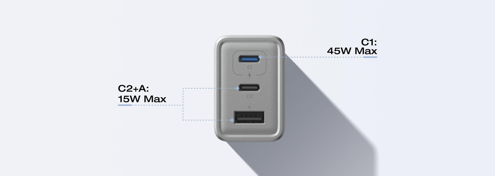 Triple Port Output: USB-C1 Up to 45W / C2+A 15W Combined