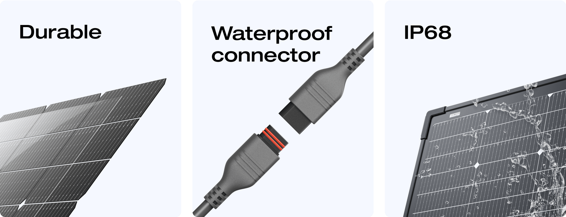Easily connect to third-party solar systems using the included photovoltaic connector (MC4 compatible)[4]. Safely charge your power systems and portable power stations with XT60 connectors, featuring waterproof, touch-safe, anti-leak technology for reliable performance.