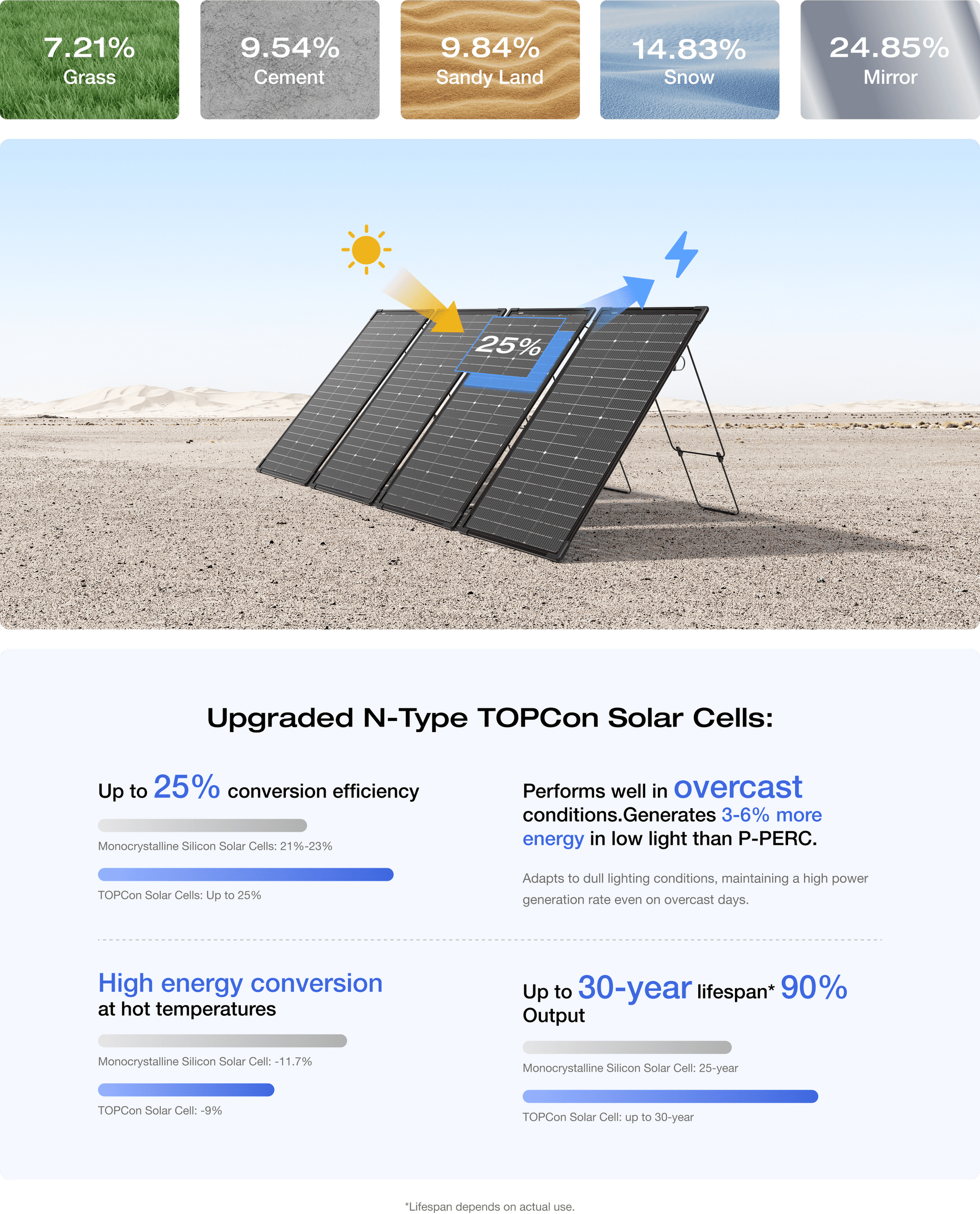 With N-Type TOPCon technology, achieve up to 25% conversion efficiency. The dual-sided design generates Max. 138W[2] bifacial output, capturing more solar energy.
