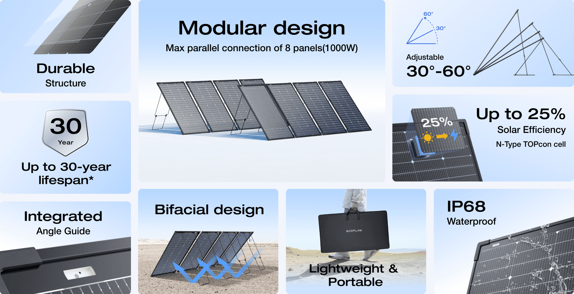 The EcoFlow 125W Bifacial Solar Panel features an innovative modular design, delivering 125W power, 50V, and 3A current output, designed for seamless expansion within its safe range, it offers exceptional adaptability with various EcoFlow portable power stations.