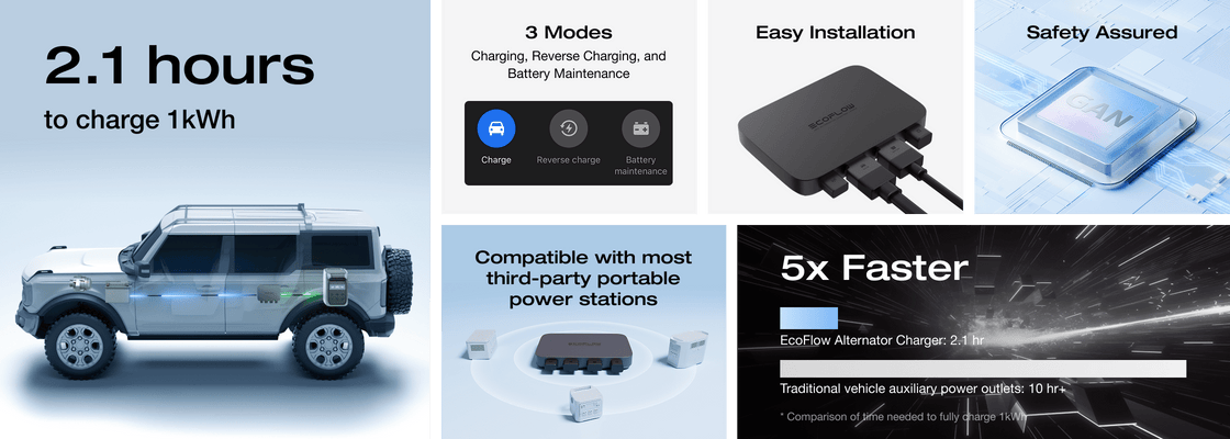 Charge 5× faster while you drive with our EcoFlow 500W Alternator Charger and recharge your power station in only 2.1 hours.