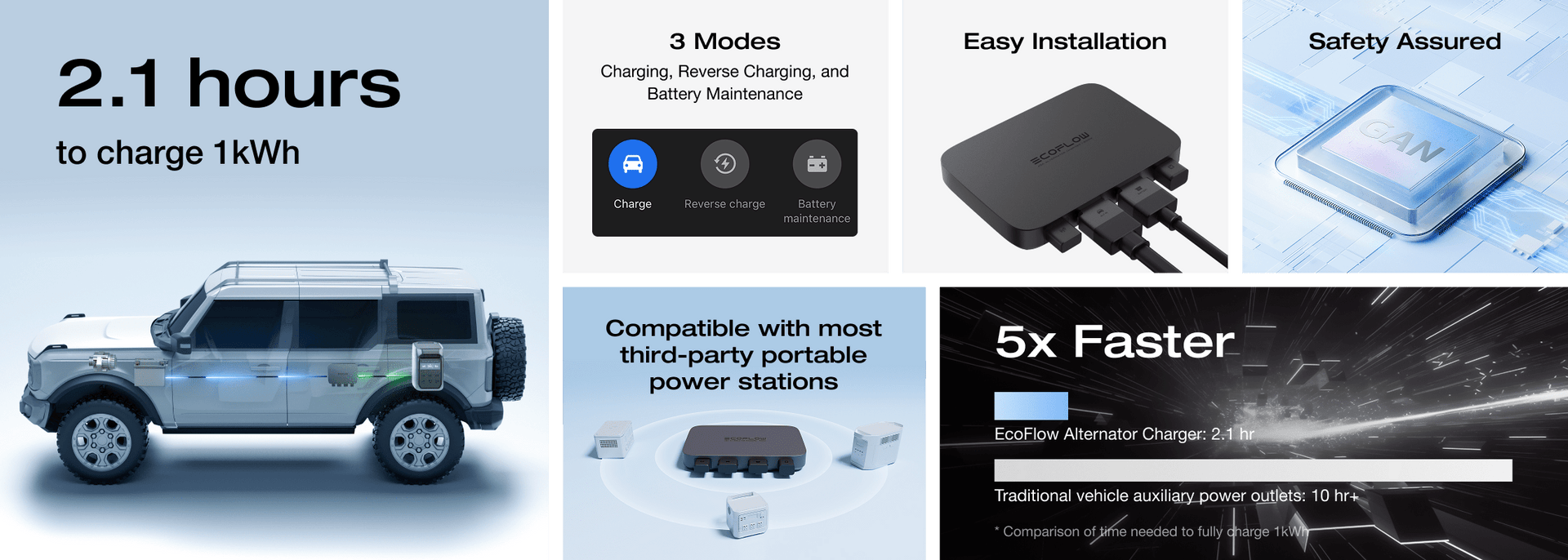 - 500W Alternator Charger, 5× faster than traditional in-vehicle auxiliary power outlets. Top up 1kWh in only 2.1 hours