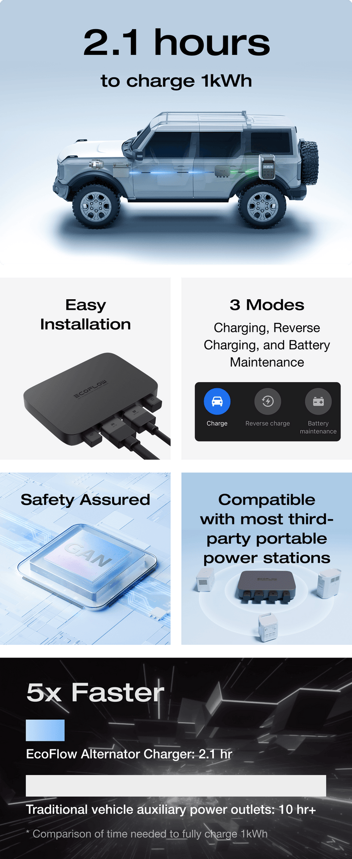With the EcoFlow 500W Alternator Charger, charge 5 times faster than with traditional vehicle auxiliary power outlets simply by using excess energy generated by your vehicle. The charger uses its onboard DC-DC converter to restore your EcoFlow power station's energy while you drive.