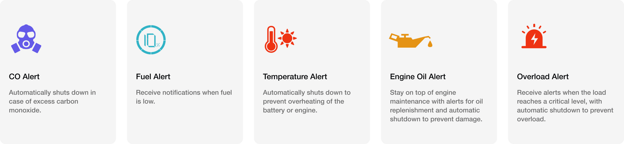 Receive 5 safety notifications directly through the EcoFlow app, ensuring remote or indoor users stay informed in real-time. All features(except fuel alerts) trigger automatic shutdowns to prioritize safety for you.