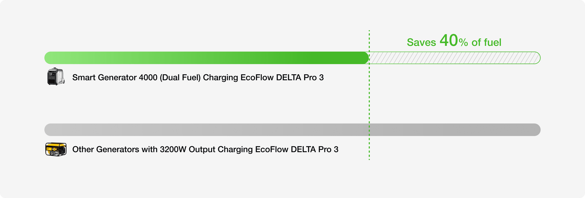 EcoFlow Smart Generator (Dual Fuel) 4000 not only offers significant fuel savings but also generates fewer emissions. Compared to traditional fuel generators, it can save 40% of fuel when fully charging EcoFlow DELTA Pro 3. This means that with the same 1 gallon of fuel, this smart generator provides 1kWh more power.
