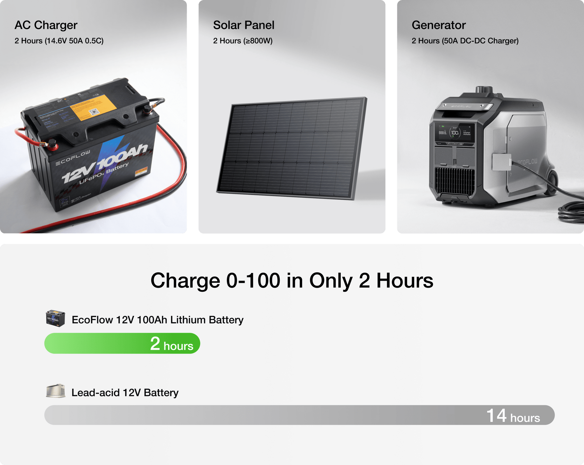 Charge the EcoFlow 12V 100Ah Lithium Battery using solar, generator, or from the grid, so no matter where you are, there's an option. Fully charge in as fast as 2 hours, 6 times quicker than lead-acid batteries.