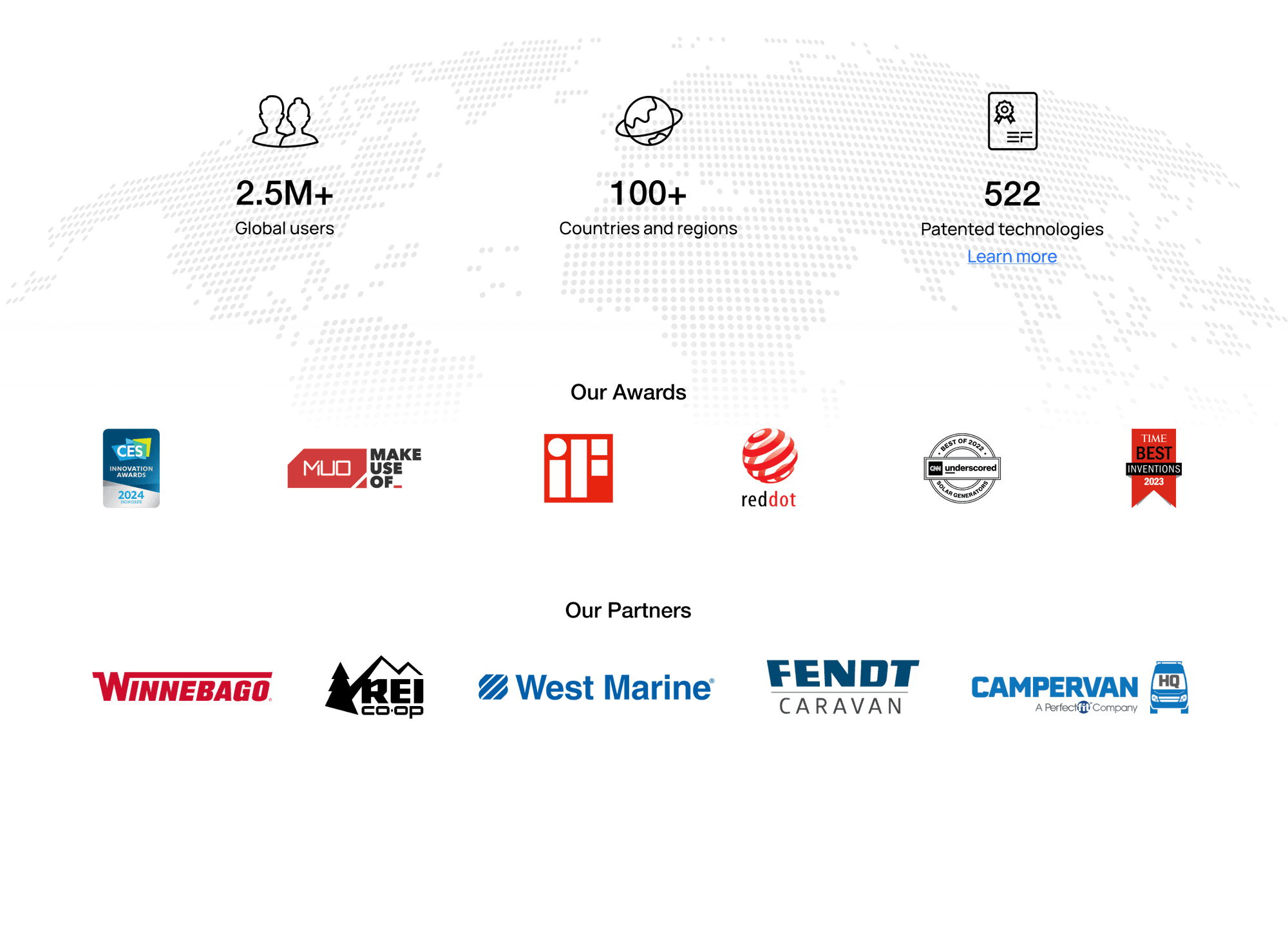 EcoFlow is sold in more than 100 countries and regions, with a user base of 3,000,000+ worldwide. Our products are at the forefront of industry technology and have been certified and affirmed by tech media and awards. We are authorized as official strategic partners by major RV and outdoor industry companies.