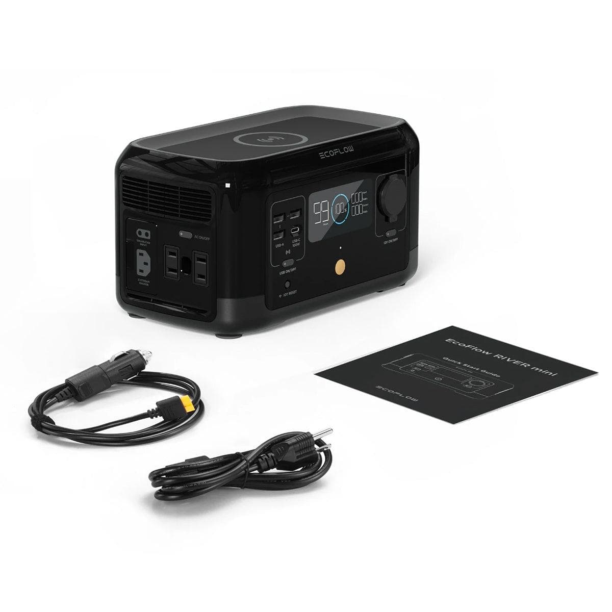 RIVER mini has all the ports & outlets you’d ever need. 2 AC wall outlets, 1 DC car outlet, 3 USB-A ports and a USB-C fast-charge port. It even has a wireless charging pad up top. With all that, you can power up to 8 devices at once.