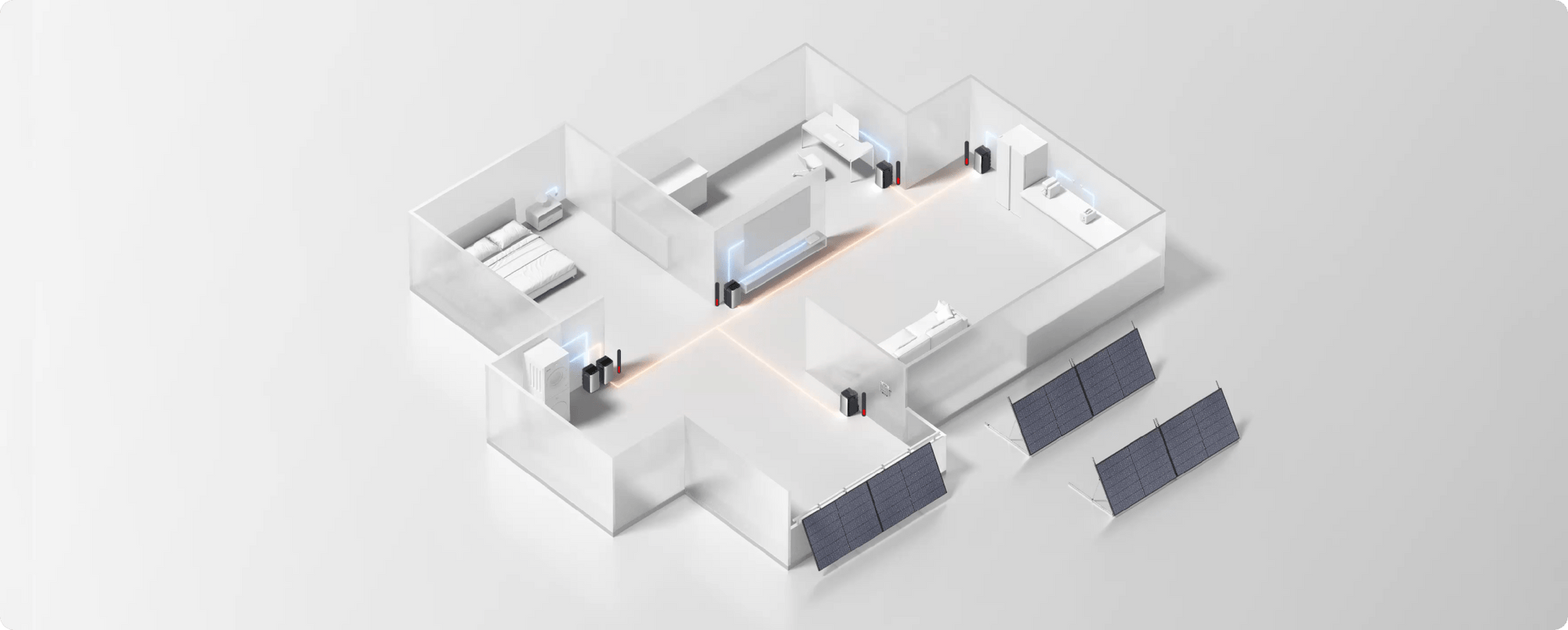 Multiple EcoFlow STREAM Ultra units form an AI-powered home energy network. Surplus solar energy automatically transfers between batteries across different rooms, maximizing solar utilization, boosting self-sufficiency, and reducing electricity costs.