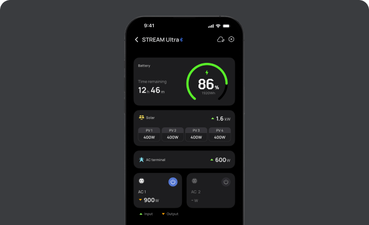 STREAM Ultra requires connection to both the EcoFlow app and Wi-Fi to enable full features. Bluetooth or LAN-only access limits functionality such as app automations.