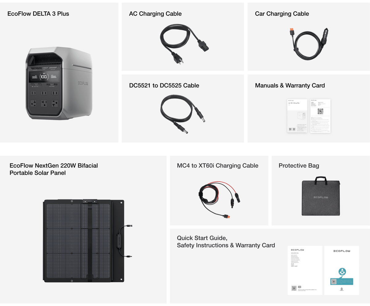Comprehensive warranties: DELTA 3 Plus includes a 5-year warranty and 12 months for the NextGen 220W Bifacial Portable Solar Panel.