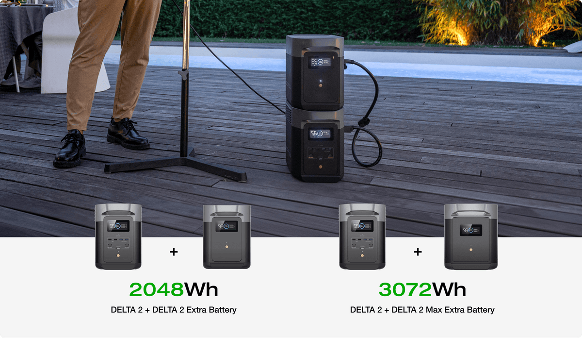 With a capacity of 1kWh to start with, you've got enough energy for your essentials for hours on end. Need even more? Add on the DELTA 2 extra battery to reach 2048Wh, or add on the DELTA 2 Max Extra Battery to hit 3072Wh. Great for home backup or everyday appliances.