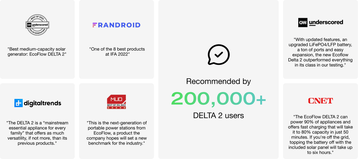 Pair with solar panels and charge in as fast as 3-6 hours with 1x400W, 2x220W portable solar panels. With its MPPT (Maximum Power Point Tracking) smart algorithm, DELTA 2 can actively detect the voltage and current in real-time to reach the maximum power point with >98%