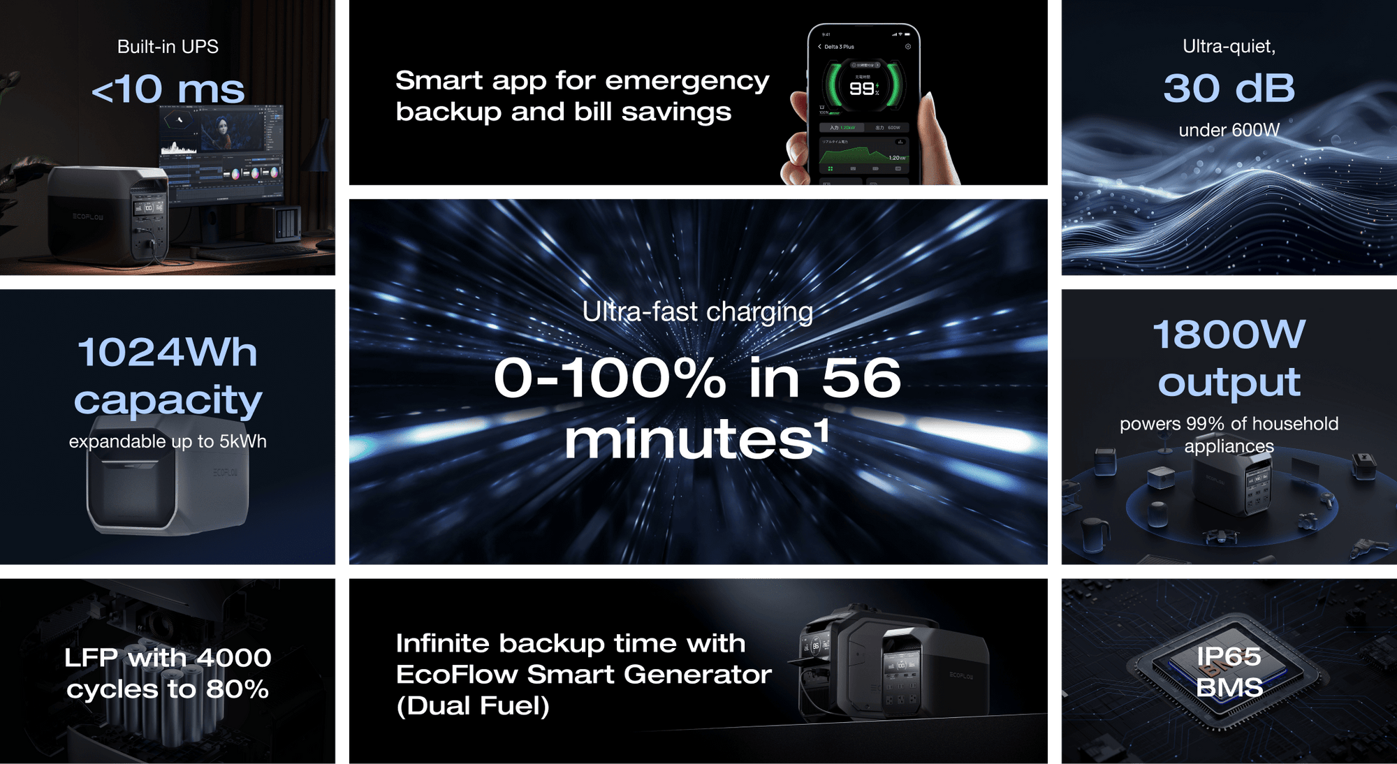 Multi-Charging (AC + Solar), Full Charge in 56 Minutes with 1500W Input