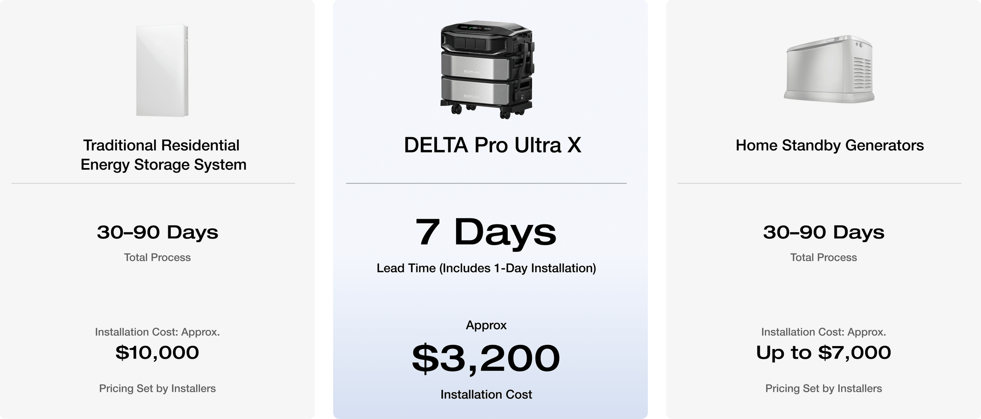 4. Installation time and cost savings are based on internal testing compared with conventional home standby generators and traditional residential energy storage systems. Actual results may vary depending on installer, site conditions, and especially local permit approval times.