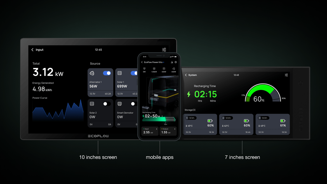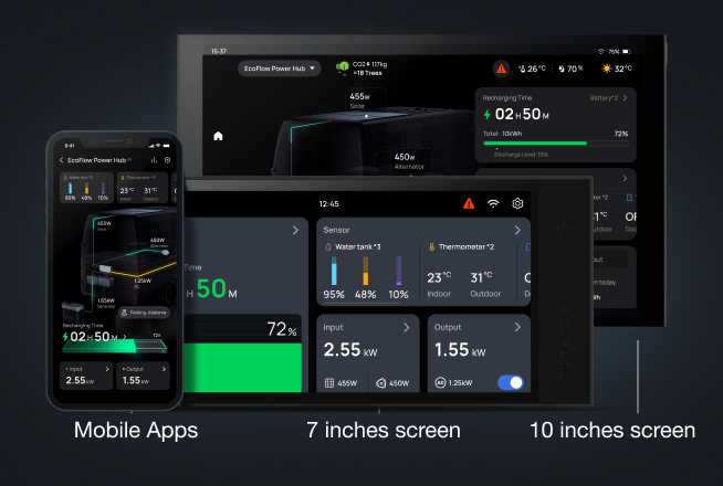 Seamlessly track data across multiple devices and screens, including 2 monitors and the EcoFlow app.