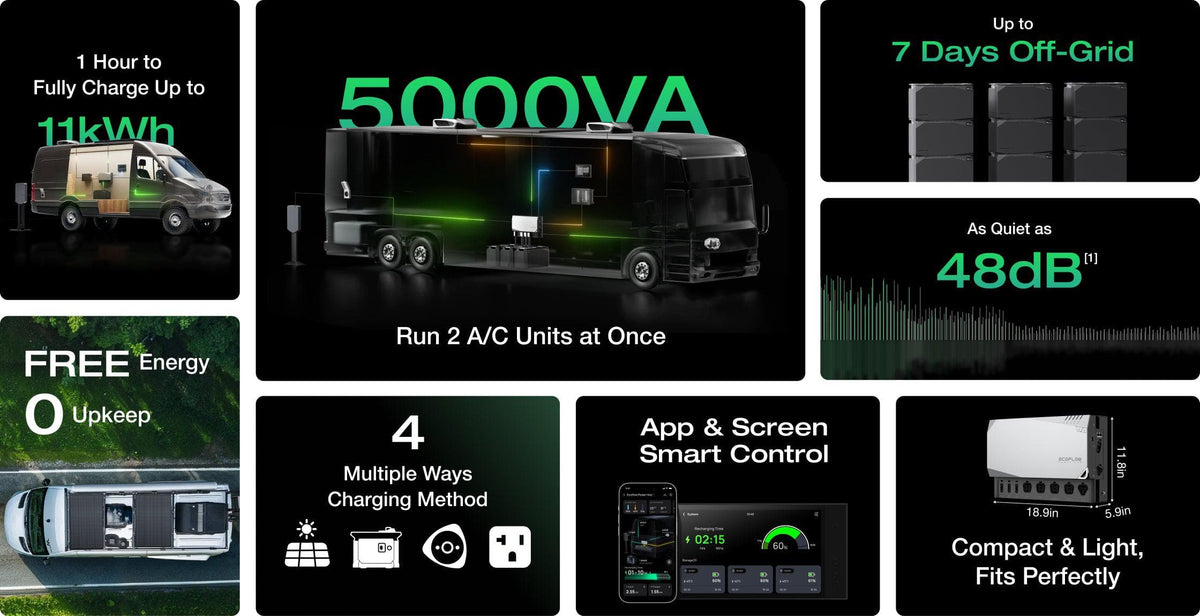 Suitable for luxurious RV travel in Class A and Class C motorhomes, the EcoFlow PowerLuxe solution ensures comfort and a steady energy flow for your entire motorhome. Its advanced 48V electrical architecture offers industry-leading safety and efficiency. For extended road trips, store up to 45kWh of power and generate tremendous amounts of energy from solar and alternator, for ultimate on-the-go comfort.