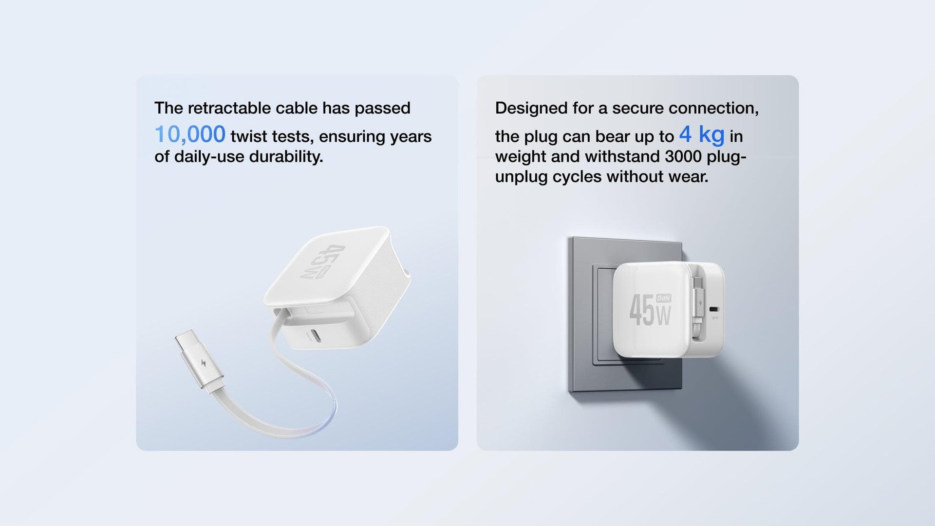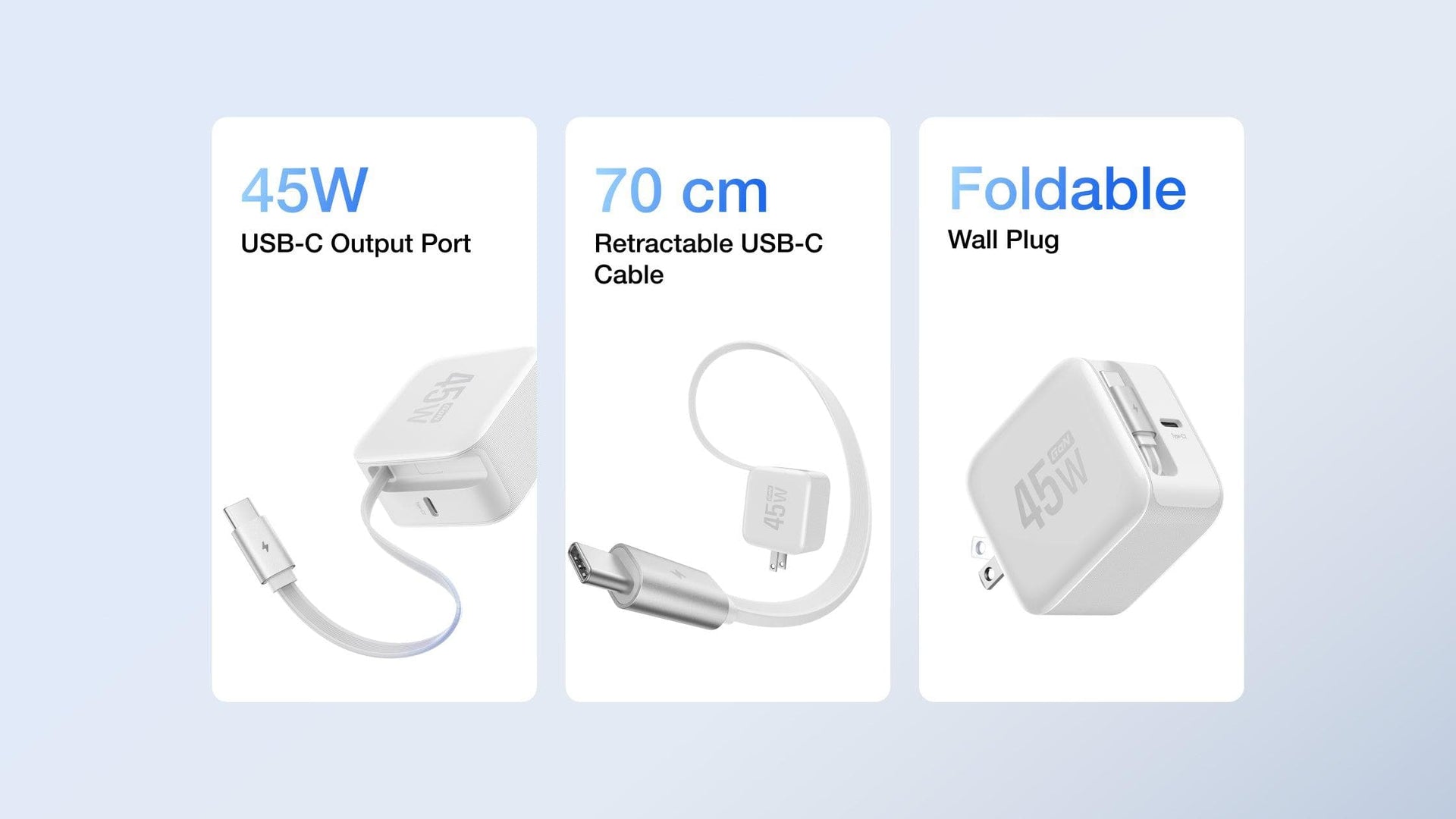 The 65W model measures 52.5 × 51 × 51.3mm and the 45W model measures 61 × 55 × 35.2mm.Both models feature foldable plug designs for easy portability, making them suitable for daily commuting or business travel.