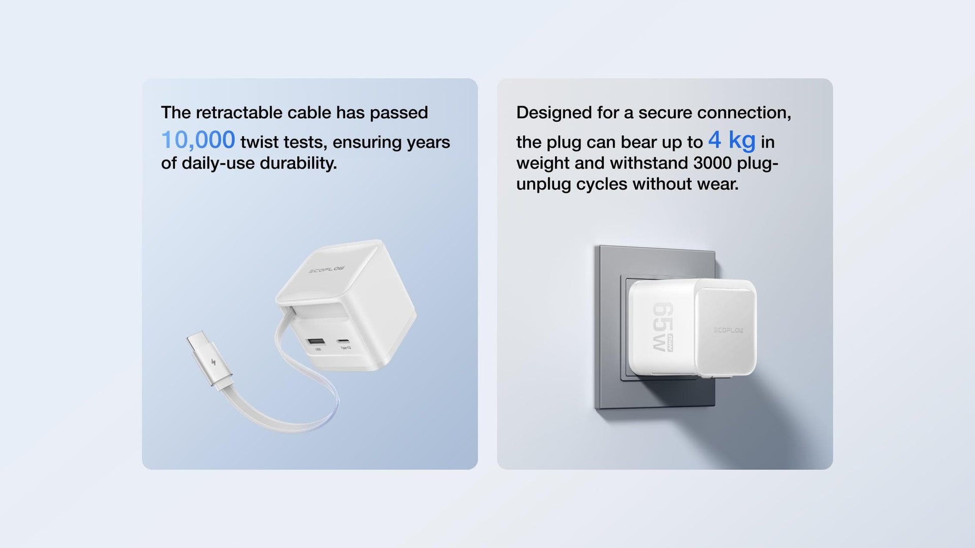 This product is constructed with high-strength metal materials and a reinforced hinge design. The plug prongs have undergone multiple folding tests, demonstrating excellent durability. Under normal usage, frequent folding will not cause looseness or breakage, ensuring a stable connection and portability over the long term. To extend the product’s lifespan, it is recommended to avoid excessive force or angled operations when folding or unfolding.