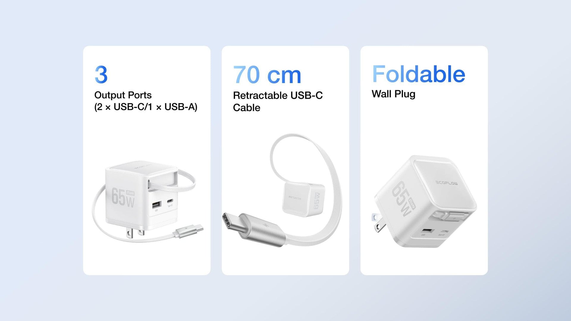 The 65W model measures 52.5 × 51 × 51.3mm and the 45W model measures 61 × 55 × 35.2mm.Both models feature foldable plug designs for easy portability, making them suitable for daily commuting or business travel.