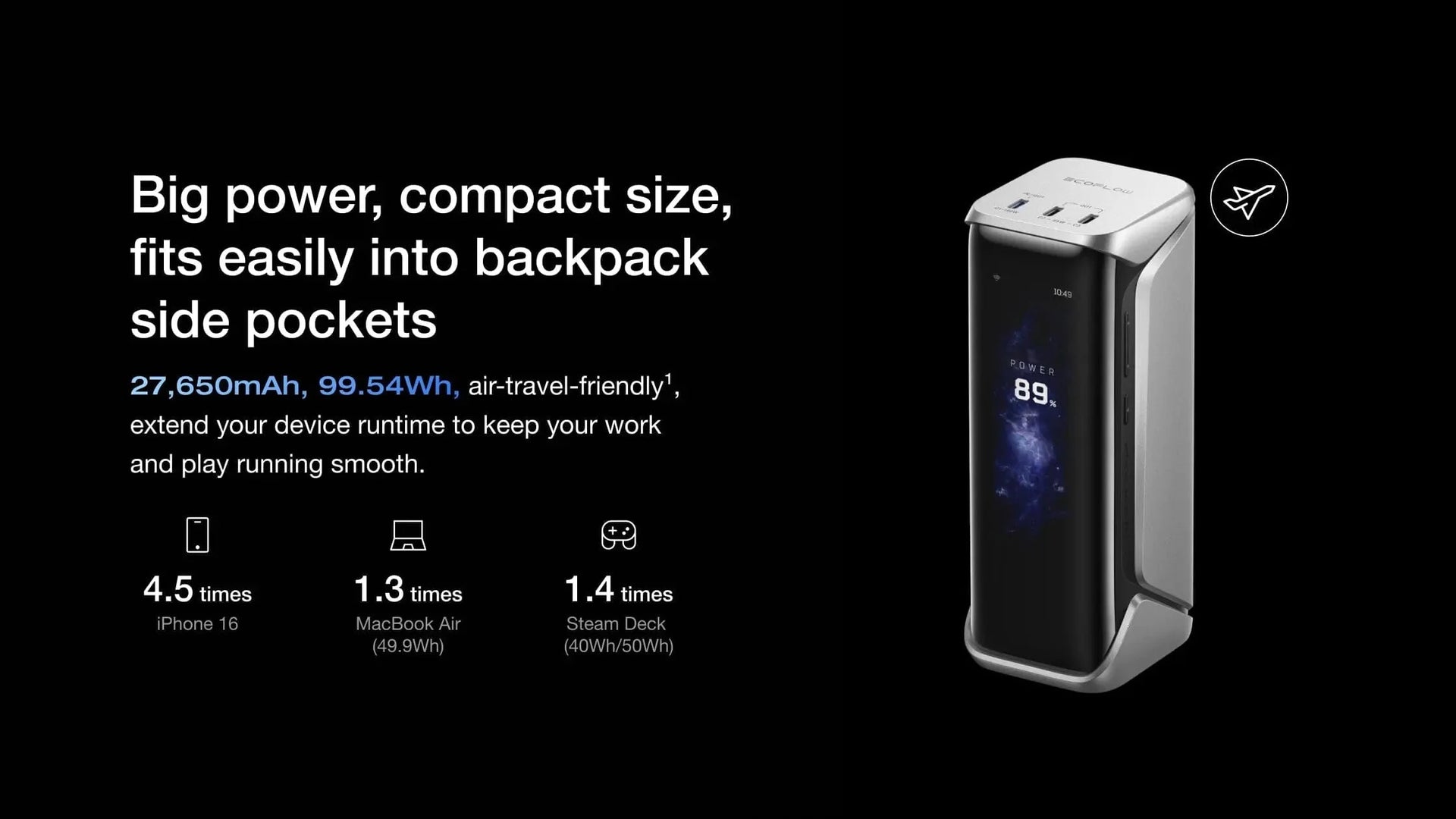 Yes, according to regulations by the International Civil Aviation Organization (ICAO) and most airlines, carrying a power bank with a capacity under 100Wh is allowed. The RAPID Pro, with a capacity of 27650mAh (99.54Wh), meets this requirement and can be carried on board without concern.