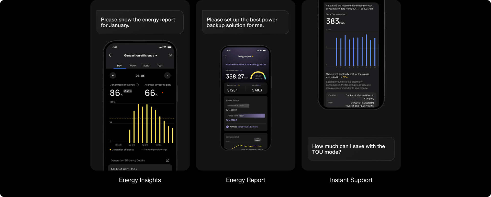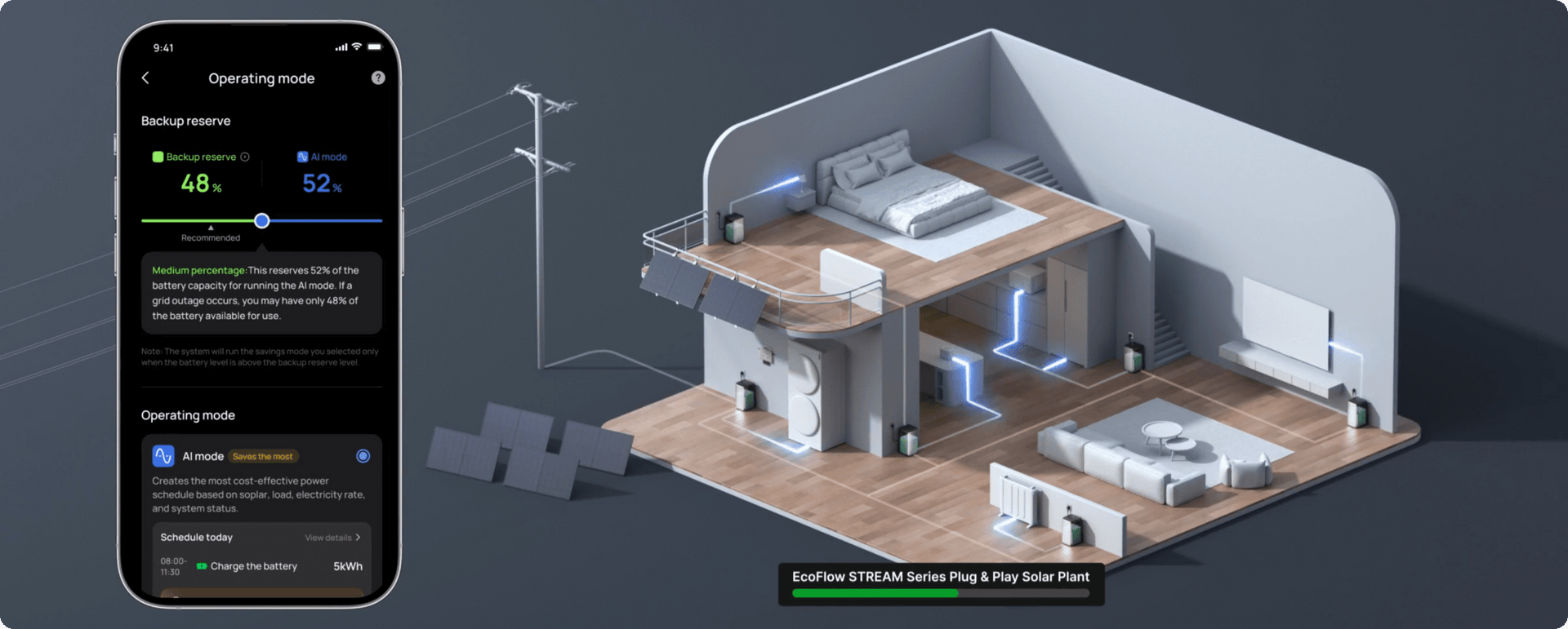 Powered by Eco-AI, the EcoFlow app offers next-level smart energy management when connected to the EcoFlow STREAM Ultra Plug-in Solar Battery. AI-TOU Mode maximizes your savings by analyzing grid and solar data, while the AI Energy Assistant gives you 24/7 control. Customize energy routines and control devices remotely—anytime, anywhere.