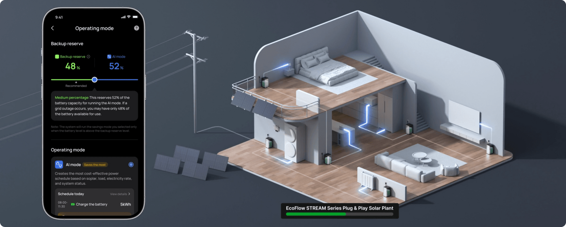 Multiple EcoFlow STREAM Ultra units form an AI-powered home energy network. Surplus solar energy automatically transfers between batteries across different rooms, maximizing solar utilization, boosting self-sufficiency, and reducing electricity costs.