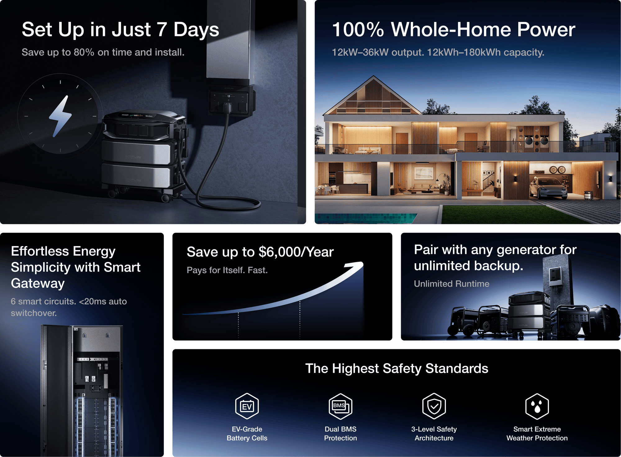 DELTA Pro Ultra X scales from 12 to 36kW. With a new Adaptive Start algorithm, it intelligently identifies connected appliances and tailors startup for each,seamlessly handling surges up to 45kW and high-demand appliances like a 5-ton AC.