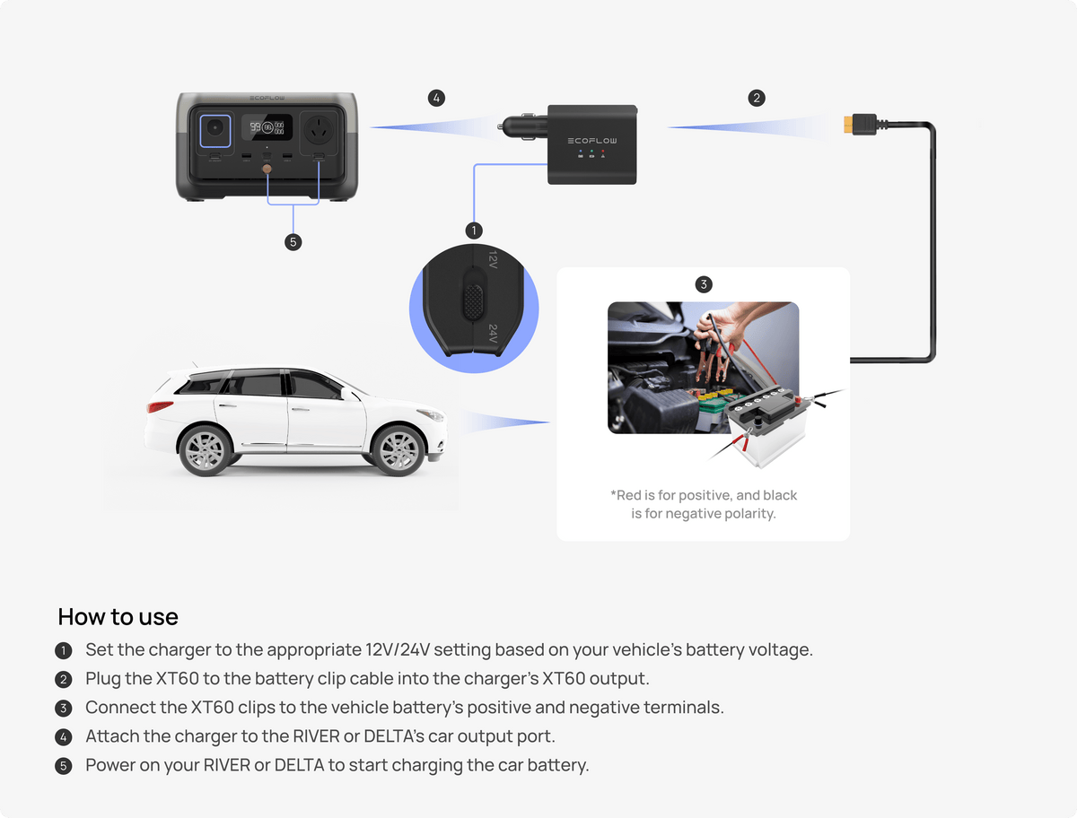 Pair it with the RIVER or DELTA Series to start your car battery. Additionally, use the Smart Auto Battery Charger for daily battery maintenance, extending battery lifespan using our safe and battery-friendly charging technology. Suitable for most cars, trucks, SUVs, and motorcycles with a 12/24V switch mode, ensuring coverage in both winter and summer.