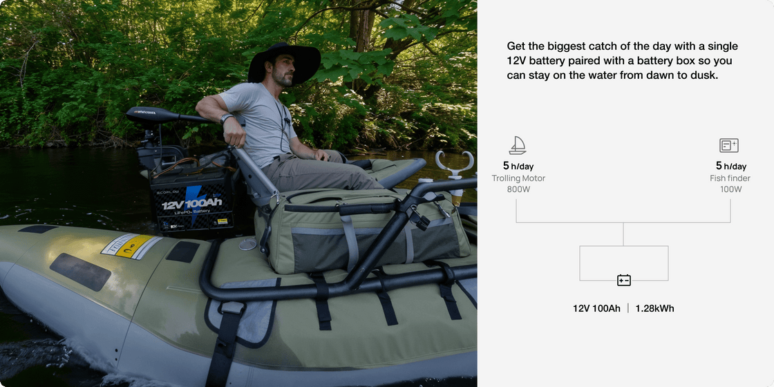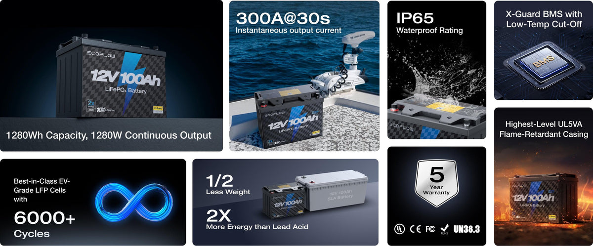 Our 12V battery is designed to start your boat's trolling motor with a continuous output of 1800W and a peak output current of 300A.