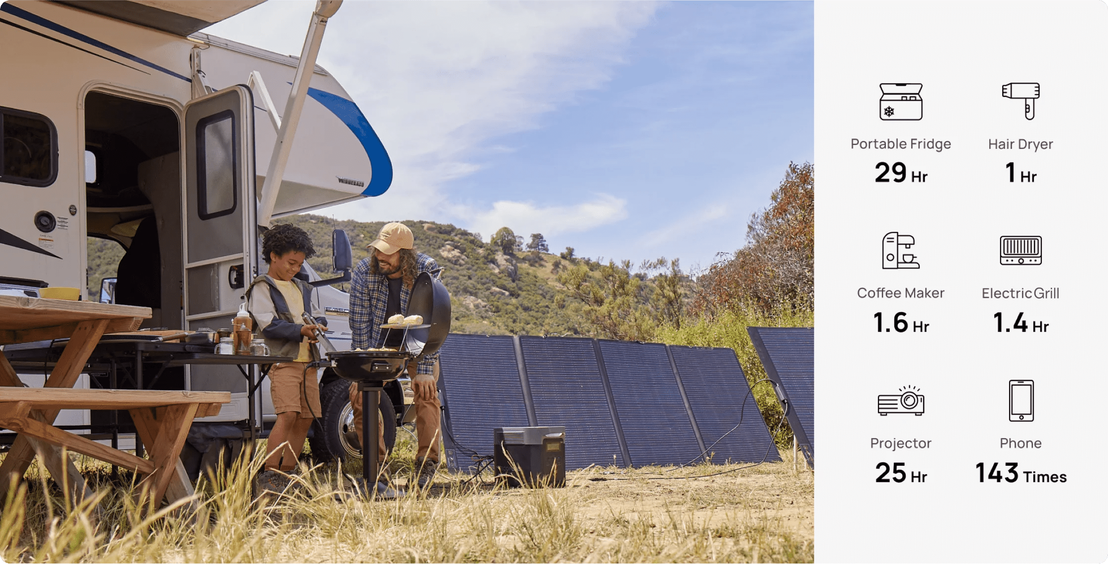 A generous 2048Wh capacity makes DELTA 2 Max ideal for home backup, running your essentials for hours. Using your transfer switch, or plugged in directly, keep your fridge on and stop food from spoiling for up to 14 hours. With its lightweight design, DELTA 2 Max is portable enough to grab and go on the next camping trip.