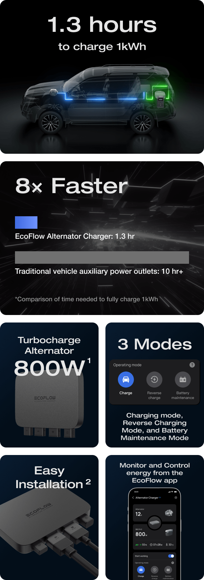 electricity while the car is running. The alternator charger utilizes the surplus electricity generated by the car's alternator and stores it in a portable power station through the charger. The impact on fuel consumption is very minimal.