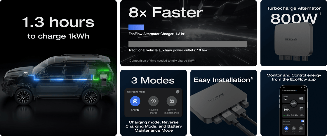 The charging power is significantly increased. The charging power of a cigarette lighter is about 100W, whereas the alternator charger can support charging continuously at a high power of 800W during driving for portable power stations, which is 8 times the power of a cigarette lighter.