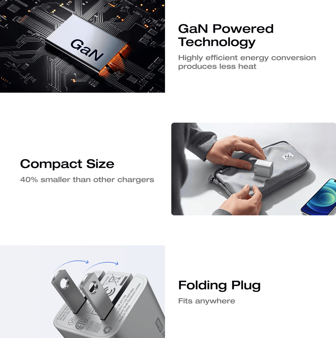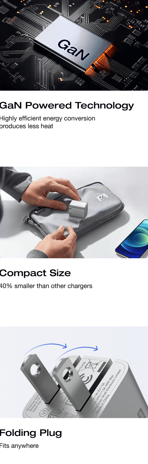 Diseño compacto: Un 40 % más pequeño que los cargadores estándar gracias al GaN. Con un enchufe plegable, cabe cómodamente en un bolsillo o bolso para viajar.