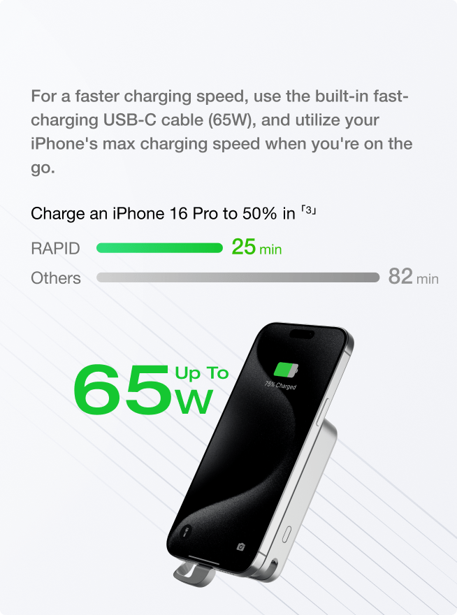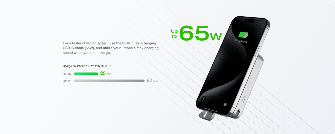 RAPID uses patented X-Stream technology for flagship smartphone-level energy density and fast charging capability. Plus, it works with the PD3.0 protocol for flash charging and recharging. Paired with Qi2-certified wireless charging and a built-in cable design, RAPID ensures snap-on charging convenience with maximum charging speeds.