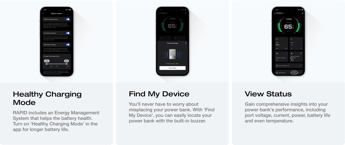 • Control de aplicación inteligente: además de ver información de carga más detallada, también puede activar el "Modo de carga saludable" para proteger su batería durante más tiempo y encontrar su banco de energía a través del timbre incorporado si lo pierde.