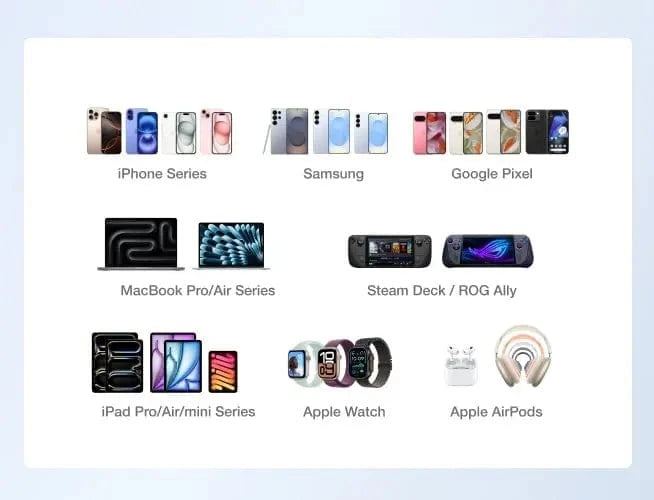 Compatible devices are laptops, phones, tablets, headphones, smartwatches, game consoles and other devices with USB-C ports such as MacBook Pro/Air, iPhone,iPad, Dell XPS and Samsung Galaxy.