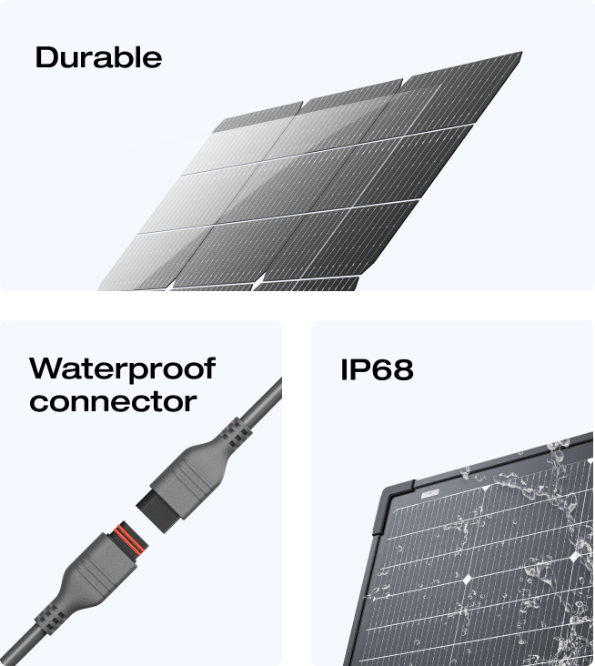 Easily connect to third-party solar systems using the included photovoltaic connector (MC4 compatible)[4]. Safely charge your power systems and portable power stations with XT60 connectors, featuring waterproof, touch-safe, anti-leak technology for reliable performance.