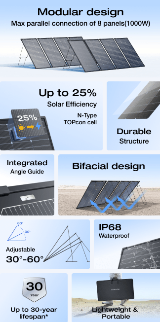 The EcoFlow 125W Bifacial Solar Panel features an innovative modular design, delivering 125W power, 50V, and 3A current output, designed for seamless expansion within its safe range, it offers exceptional adaptability with various EcoFlow portable power stations.