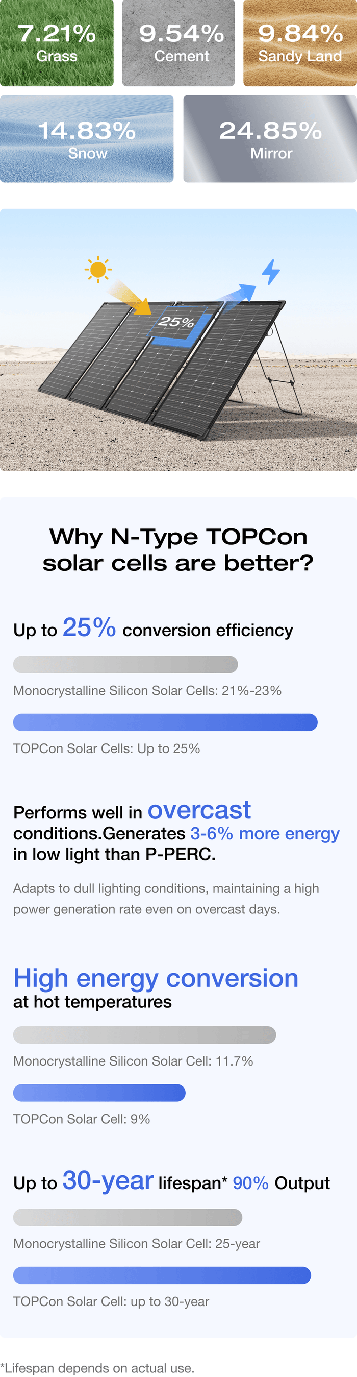 Built with robust anti-corrosive aluminum frame, TOPCon cells feature 1.1mm ultra-thin tempered glass for excellent light transmission, POE films for UV and moisture resistance, PET backsheets for durability. The panel is IP68-rated with waterproof XT60-W connector, ensuring robust, weather-resistant performance.
