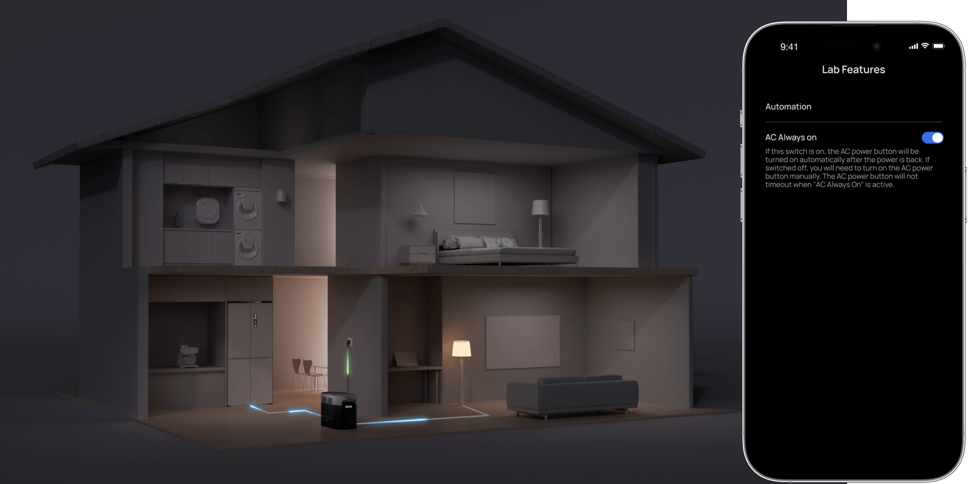 Experience peace of mind during power outages With our all-new AC Always On Mode, the AC power button stays on, even during a power outage or after the grid power is back, keeping your appliances powered no matter what.
