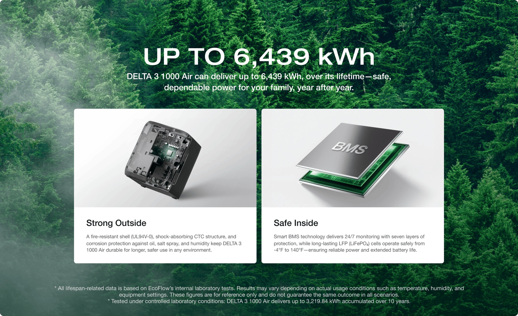 *All lifespan-related data is based on EcoFlow’s internal laboratory tests. Results may vary depending on actual usage conditions such as temperature, humidity, and equipment settings. These figures are for reference only and do not guarantee the same outcome in all scenarios.