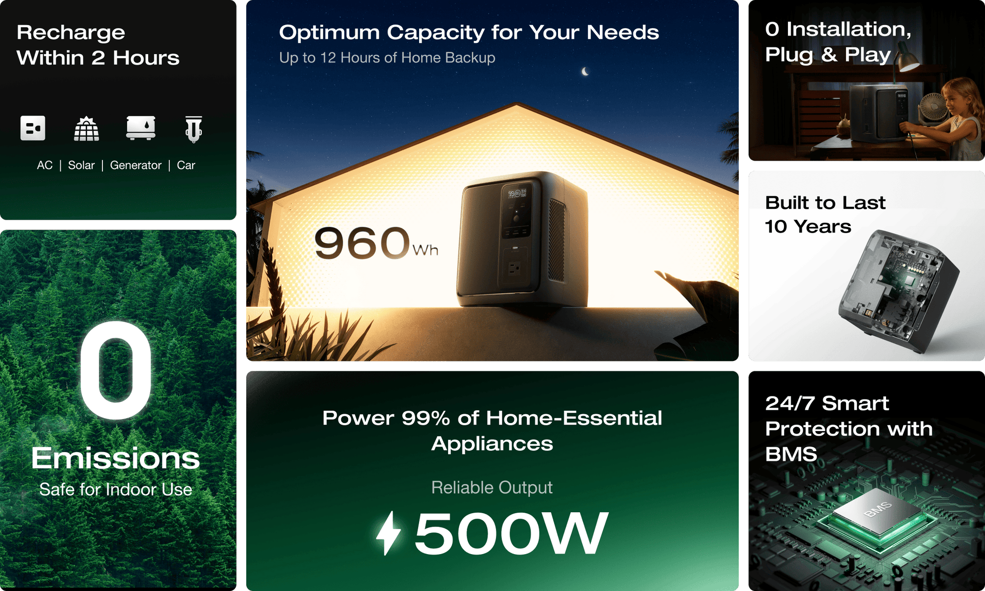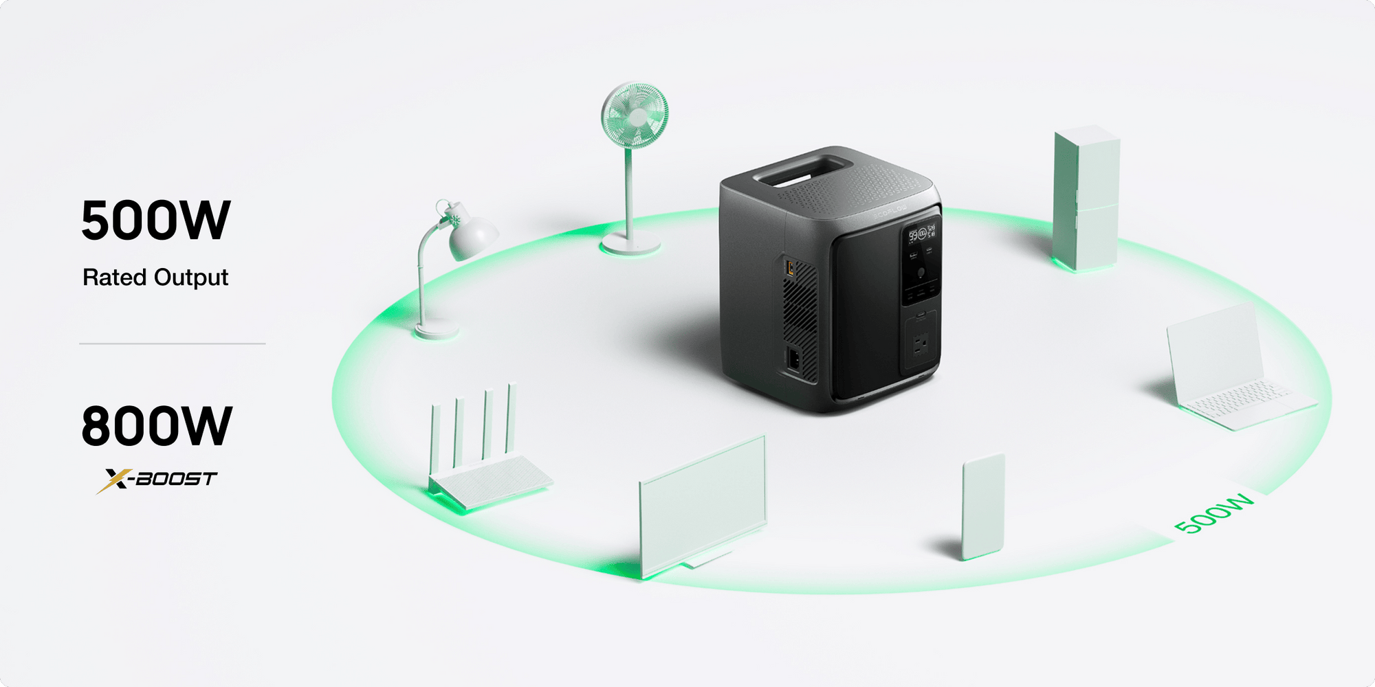 800W (surge 1000W) with X-Boost. Power 99% of home-essential appliances.
