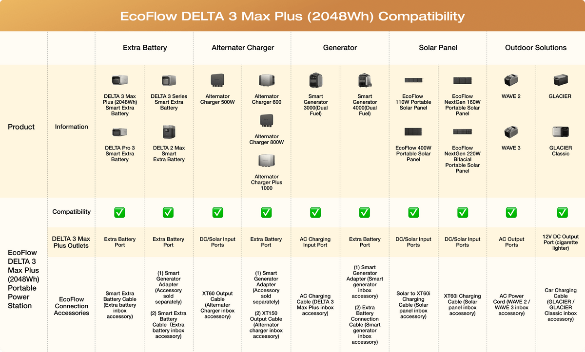 [13] Require connecting 1*DELTA 3 Max Plus (2048Wh) + 2* DELTA 3 Max Plus Smart Extra Battery with EcoFlow Smart Extra Battery Expansion Adapter. The EcoFlow Extra Battery Expansion Adapter will be released soon.