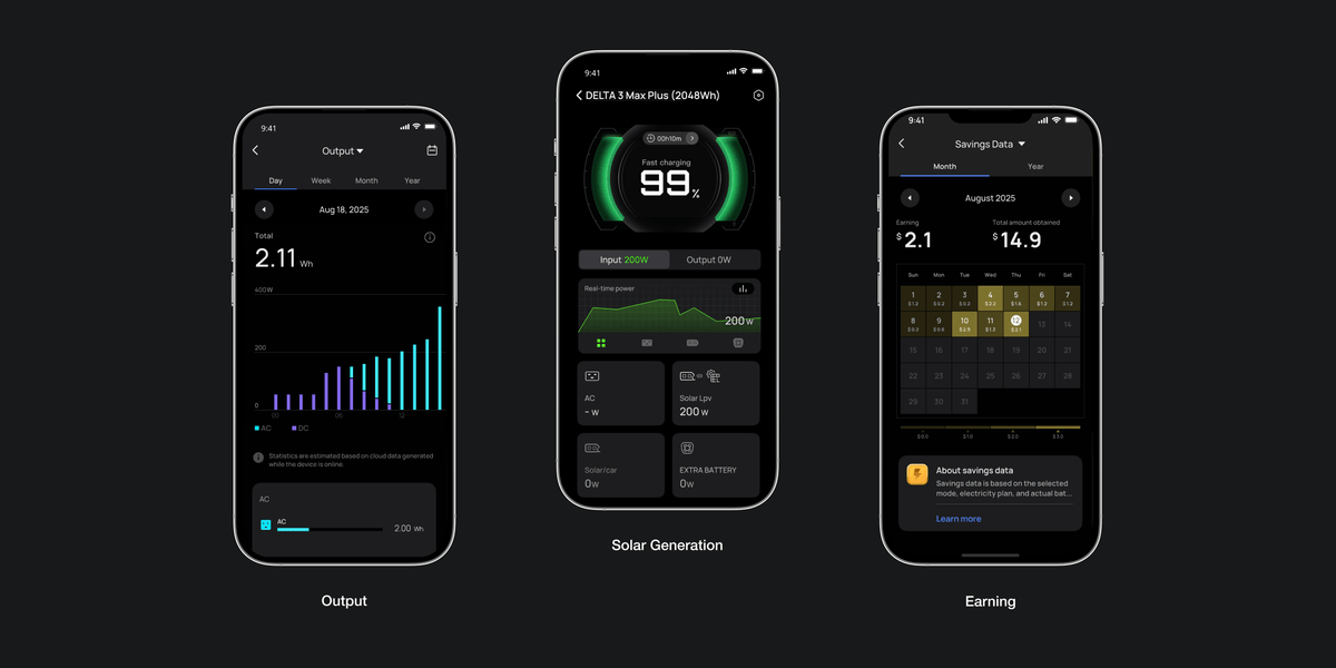 Monitor your energy usage, savings, and solar generation—all with one intuitive dashboard. Easily track battery status, real-time electricity rates, and financial savings.