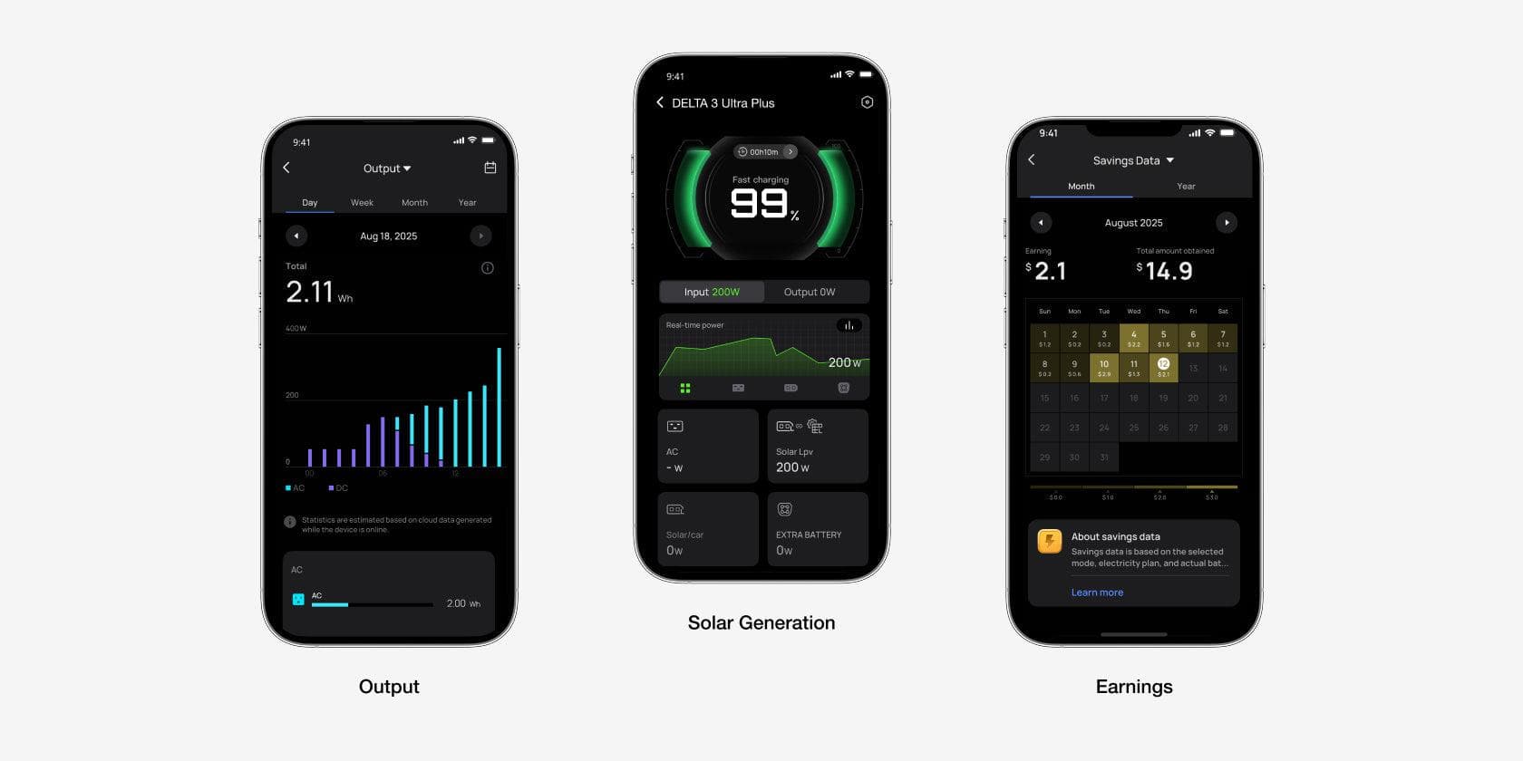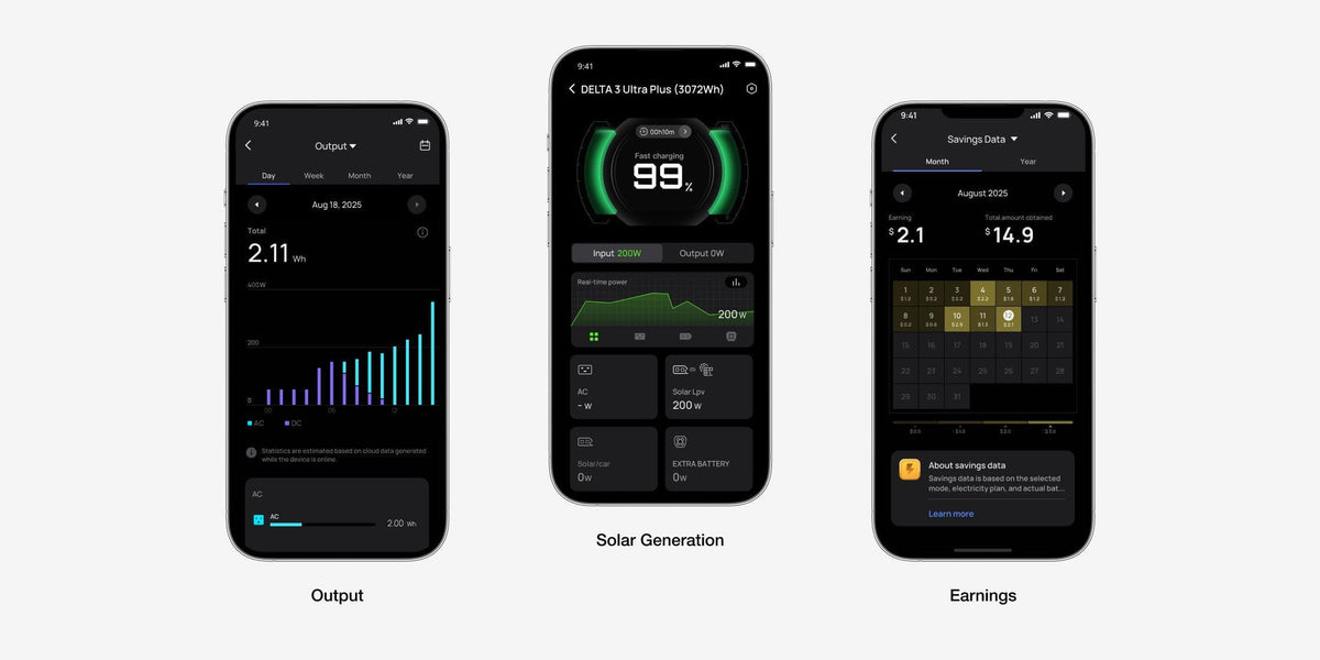 Monitor your energy usage, savings, and solar generation—all with one intuitive dashboard. Easily track battery status, real-time electricity rates, and financial savings.
