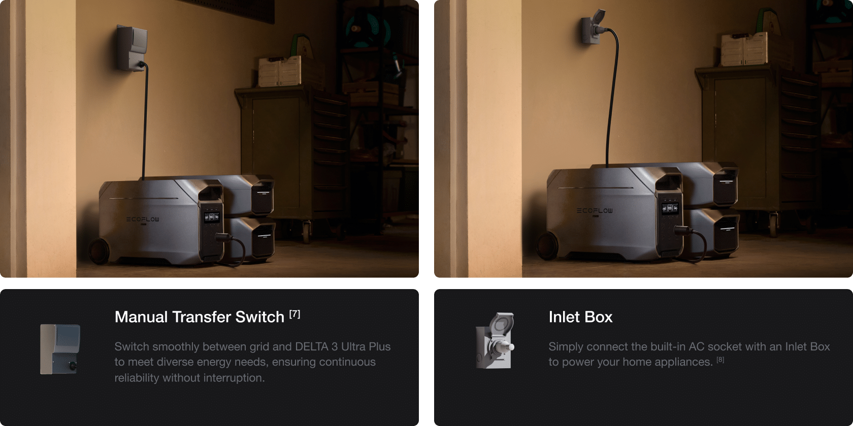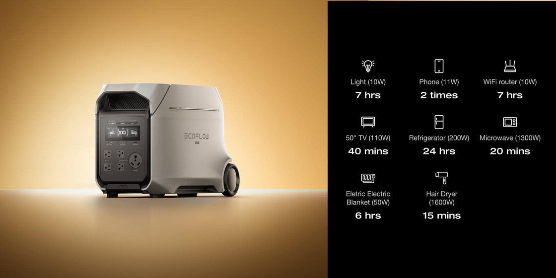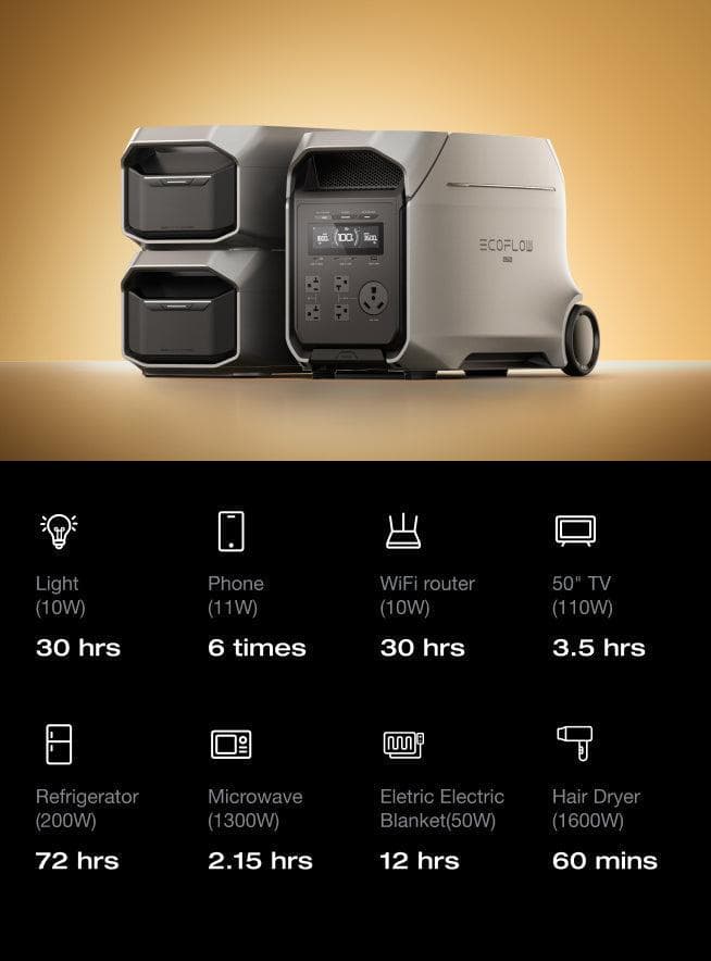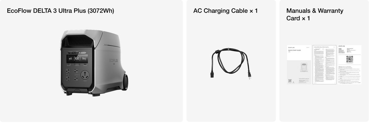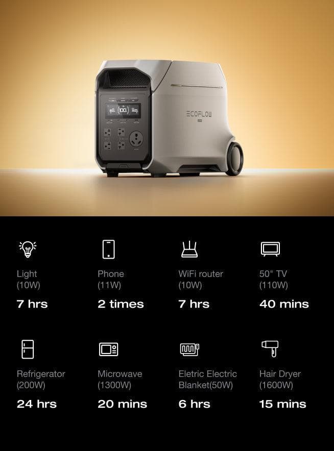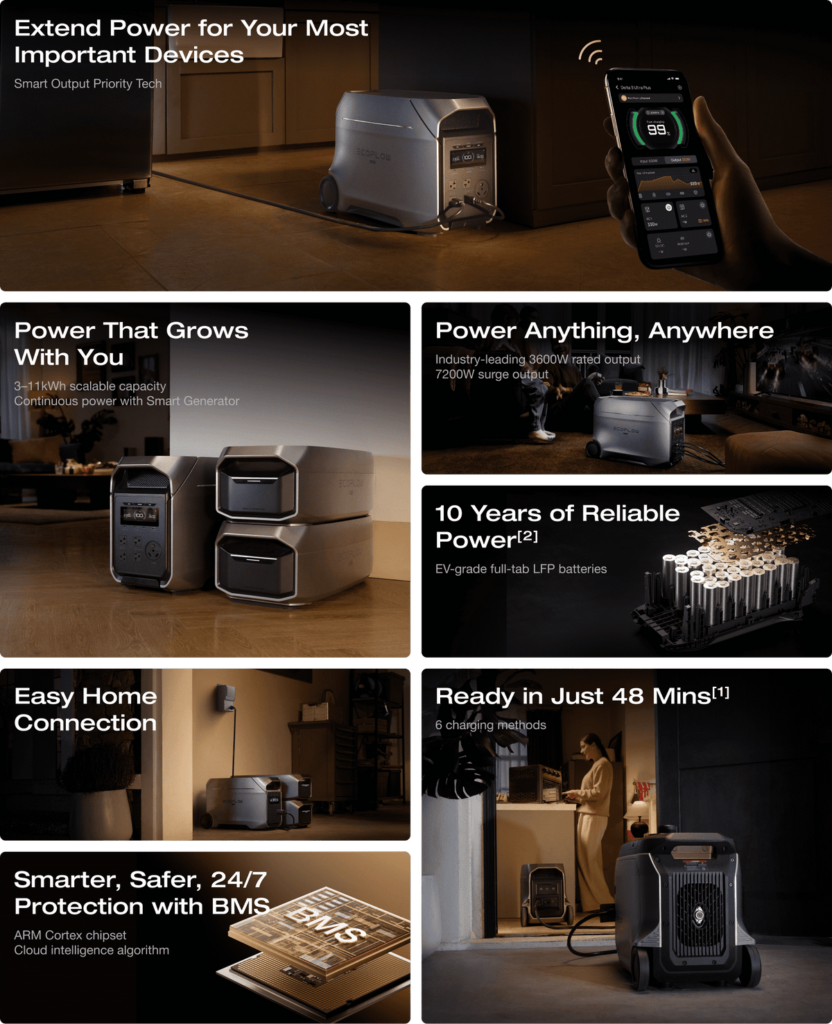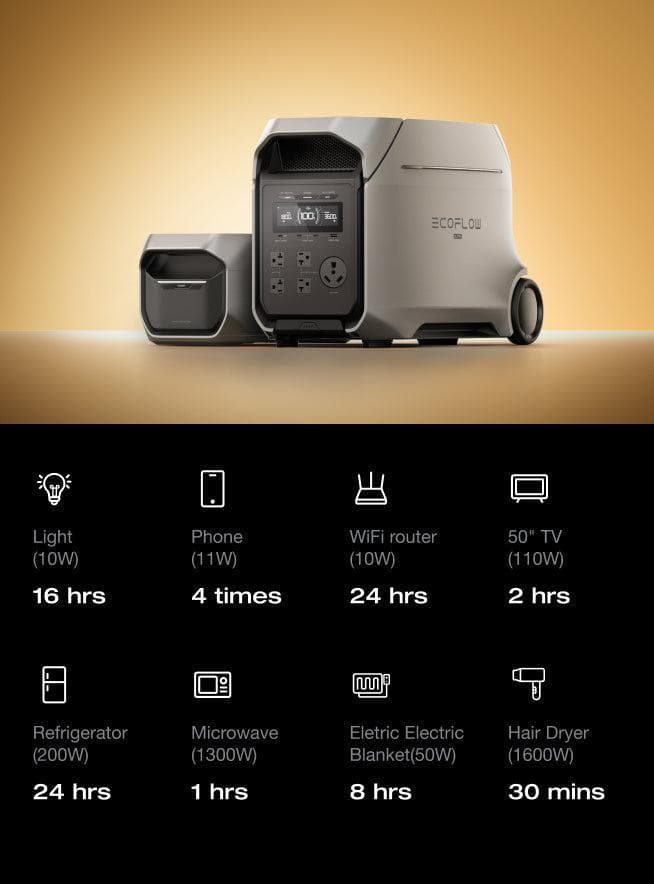 [4] Require connecting 1*DELTA 3 Ultra Plus + 2* DELTA 3 Max Plus Smart Extra Battery with EcoFlow Smart Extra Battery Expansion Adapter. The EcoFlow Extra Battery Expansion Adapter will be released soon.