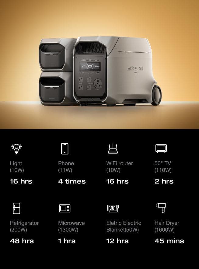[5] Require connecting 1*DELTA 3 Ultra Plus + 2* DELTA Pro 3 Smart Extra Battery with EcoFlow Smart Extra Battery Expansion Adapter. The EcoFlow Extra Battery Expansion Adapter will be released soon.