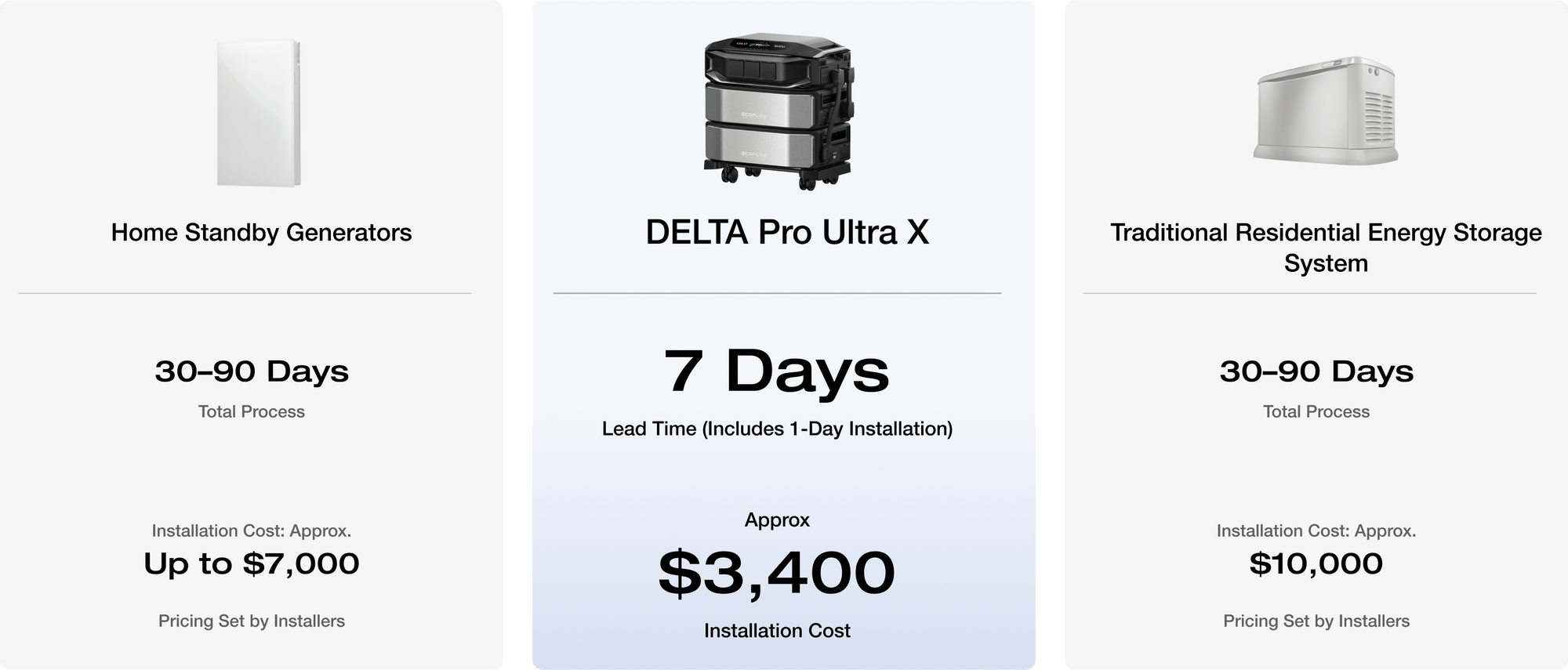 4. Installation time and cost savings are based on internal testing compared with conventional home standby generators and traditional residential energy storage systems. Actual results may vary depending on installer, site conditions, and especially local permit approval times.