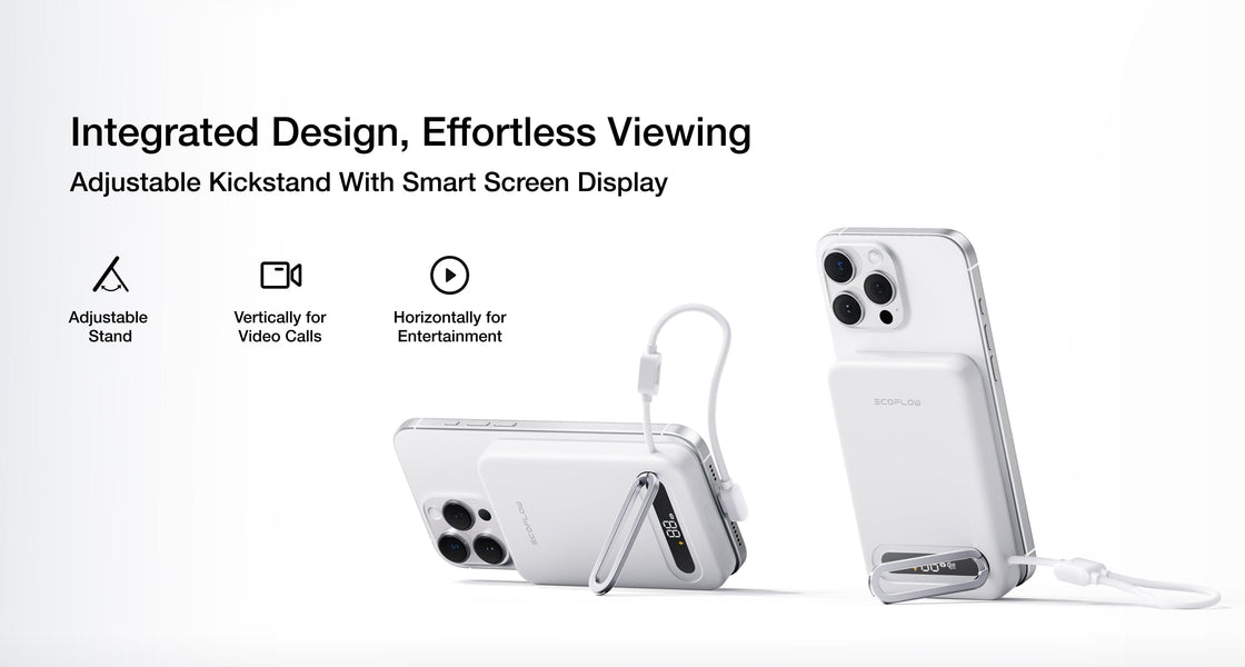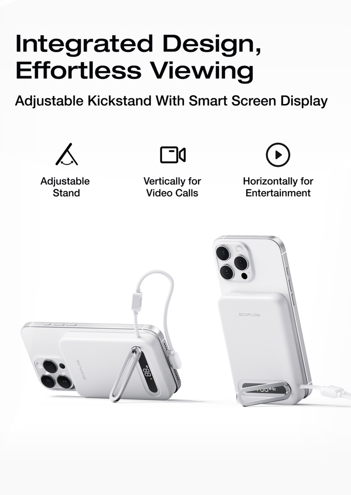 The crystal clear screen shows battery level, output, and remaining charge time. Flip out the sturdy built-in kickstand to go hands-free—vertically for video calls, horizontally for movies, meetings, or scrolling with stability.
